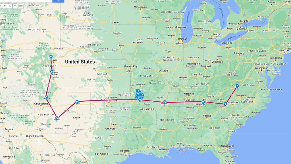 The initial plan is to take ten days to get from Willis, VA to Boulder, CO where we have tickets to see My Son the Hurricane on June 10. Along the way there will be stops in Spartanburg, SC, Nashville, TN, Memphis, TN, Clarksville, AR (where we will spend and extra day on a 300 mile trek through the Ozarks), Amarillo, TX, Roswell, NM (pure schlock, I know), Santa Fe, NM and Canon City, CO. (A rough point to point map below)